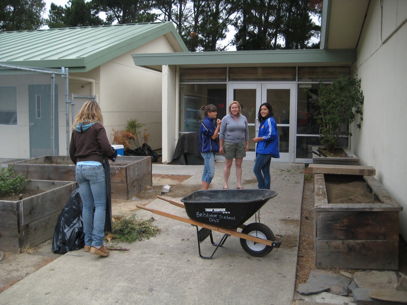 What a community! What a town! Tomorrow we scheduled a work day to get all of our plants in the long bed in the courtyard. Brisbane resident – Maia Highsmith of Special Gardens (out of Redwood City) who has been consulting on the selection of our plants phoned last night, she wanted to know if we wanted a couple of her employees to come up today (Saturday 10/23) and prep the beds and plant the big stuff to give us a head start. (Humm...let me think about that.... YES!) To make a long story short they planted it all!